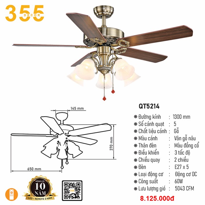 Quạt Trần QT5213 Giá gốc là: 8.125.000 ₫.Giá hiện tại là: 3.656.250 ₫.